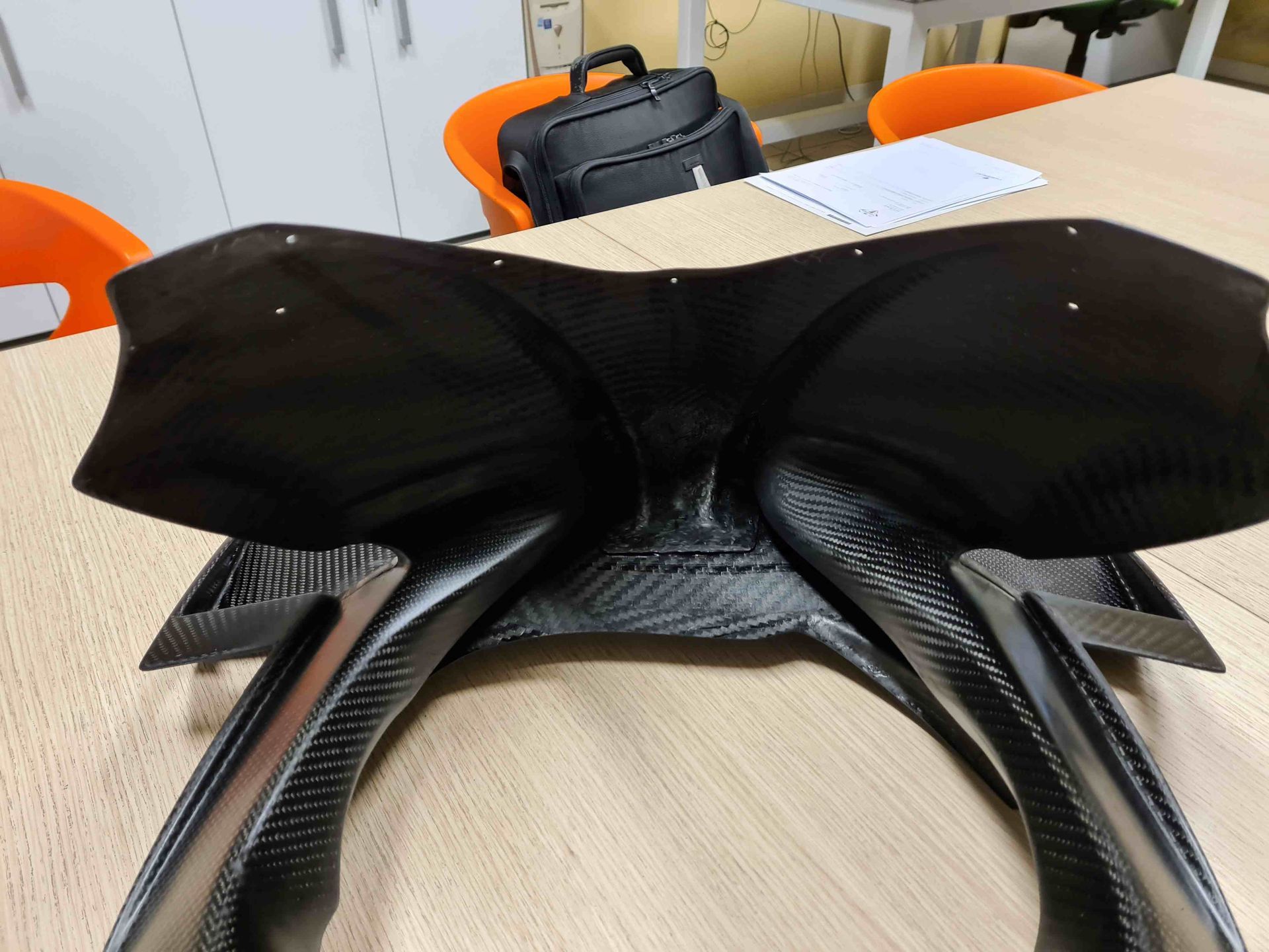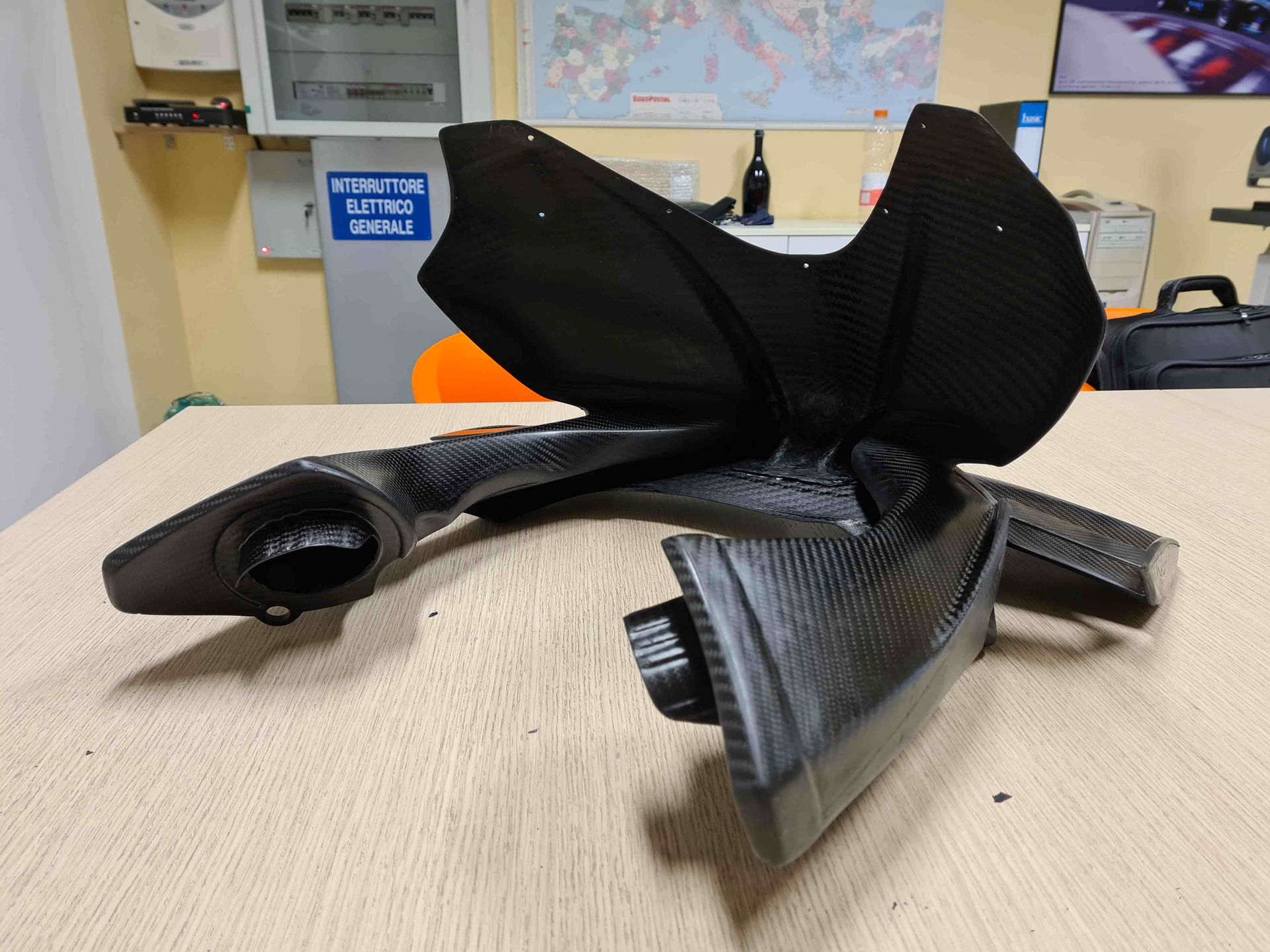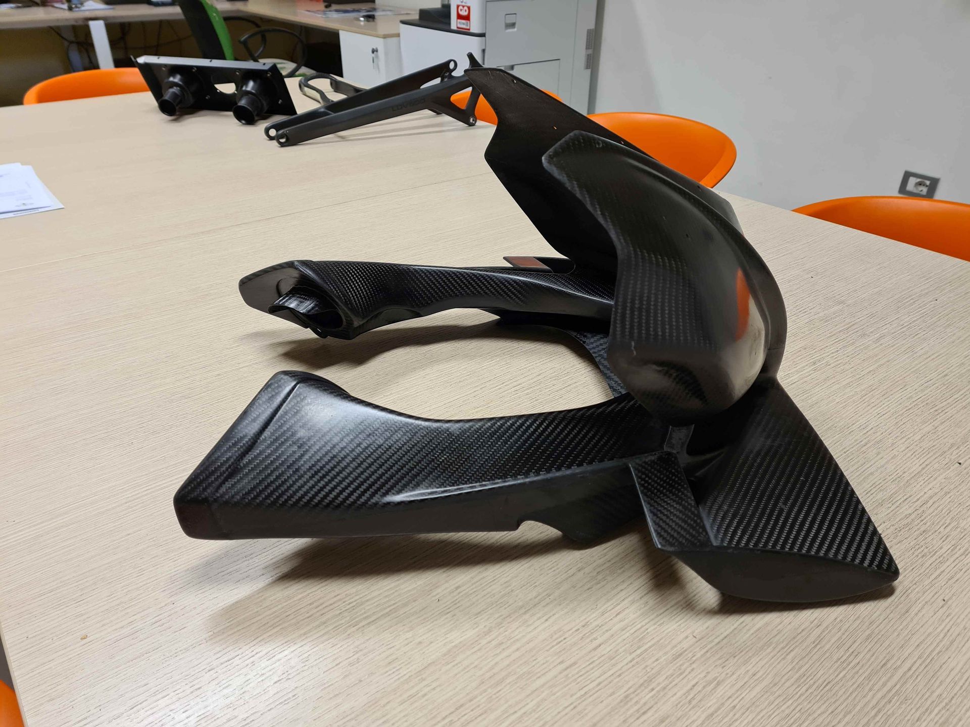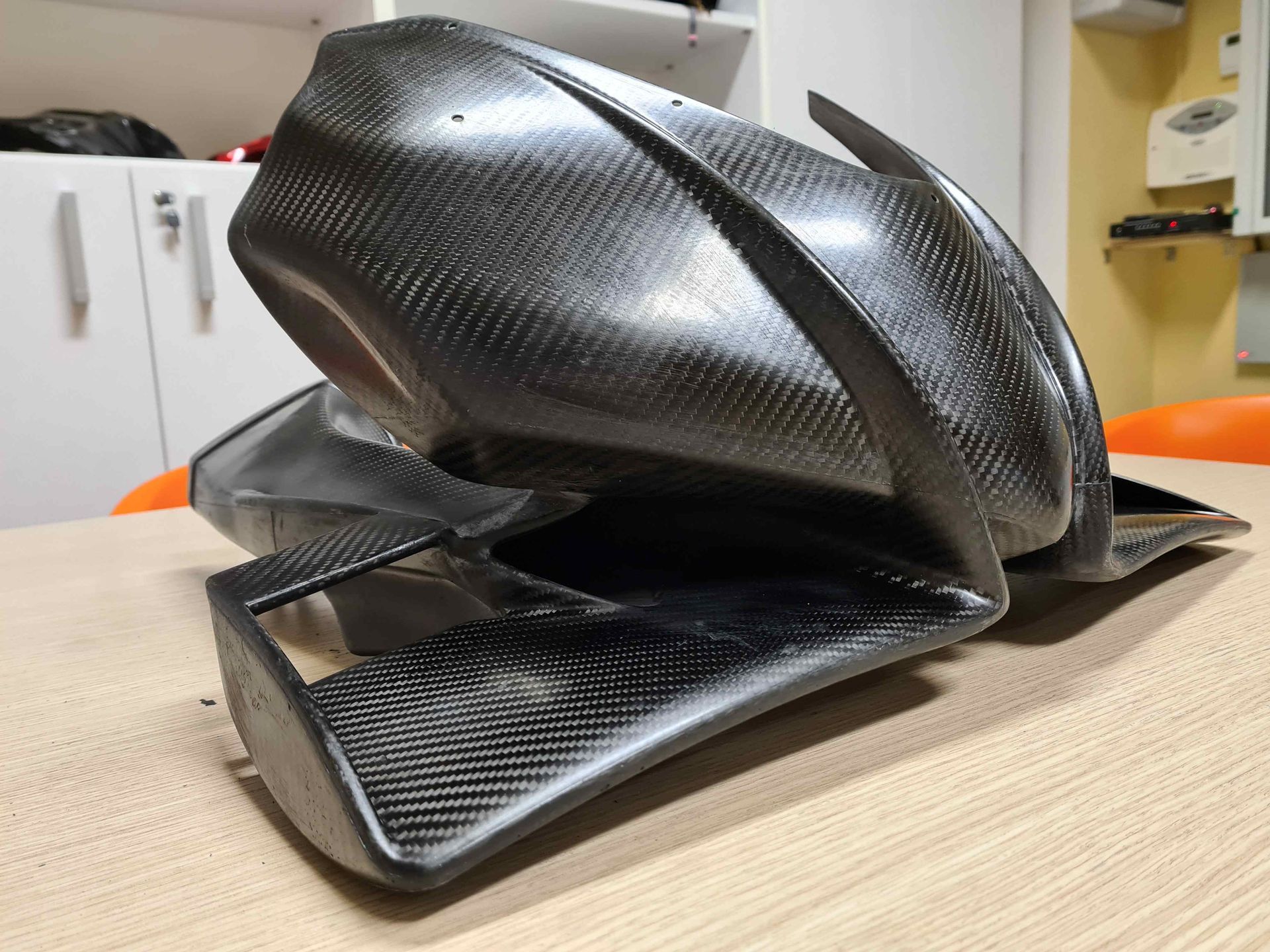 The fairing is made as a one-piece body, including the air ducts and fins using the autoclave process at 5 bar pressure. It is a one-off.
