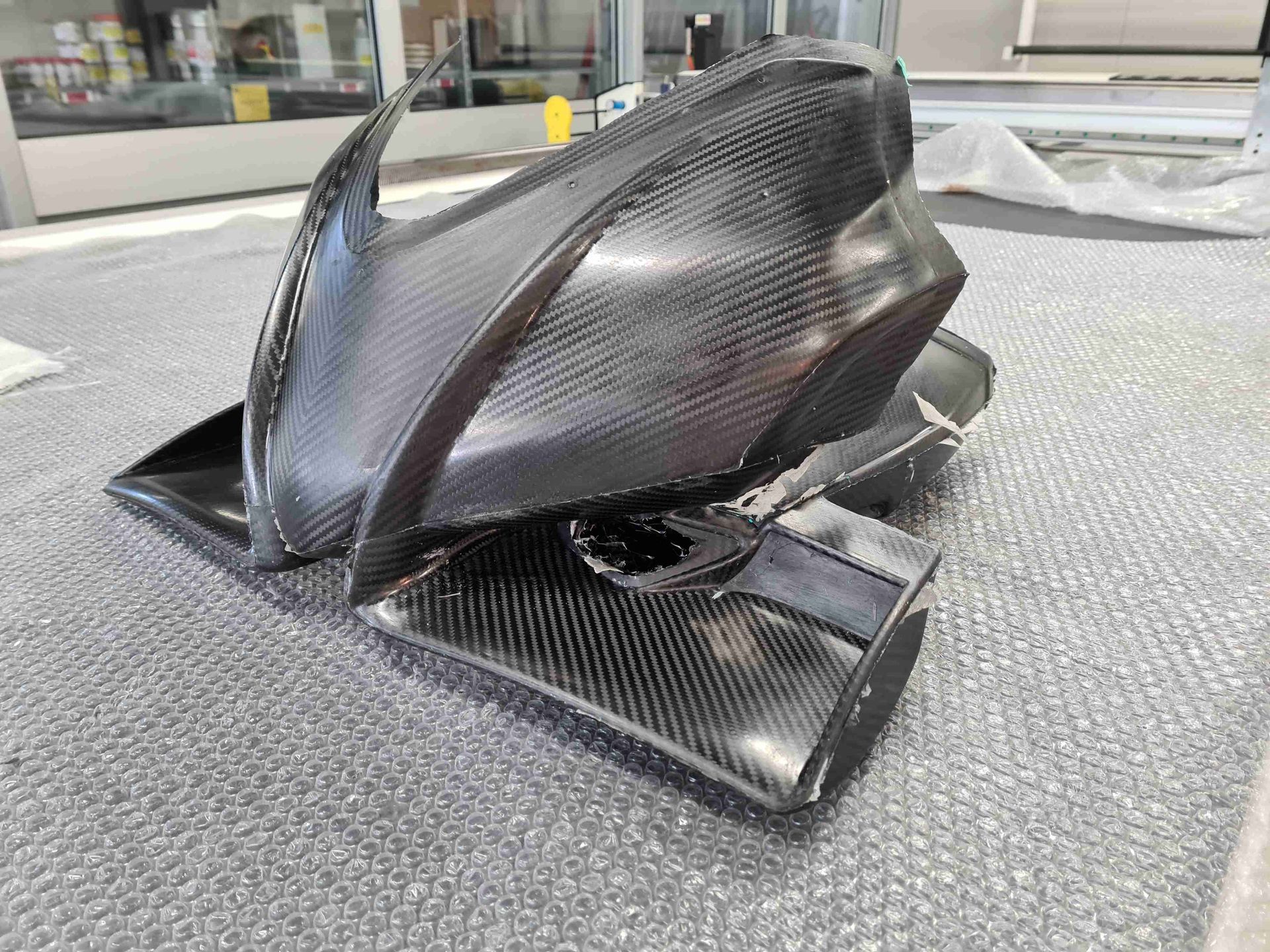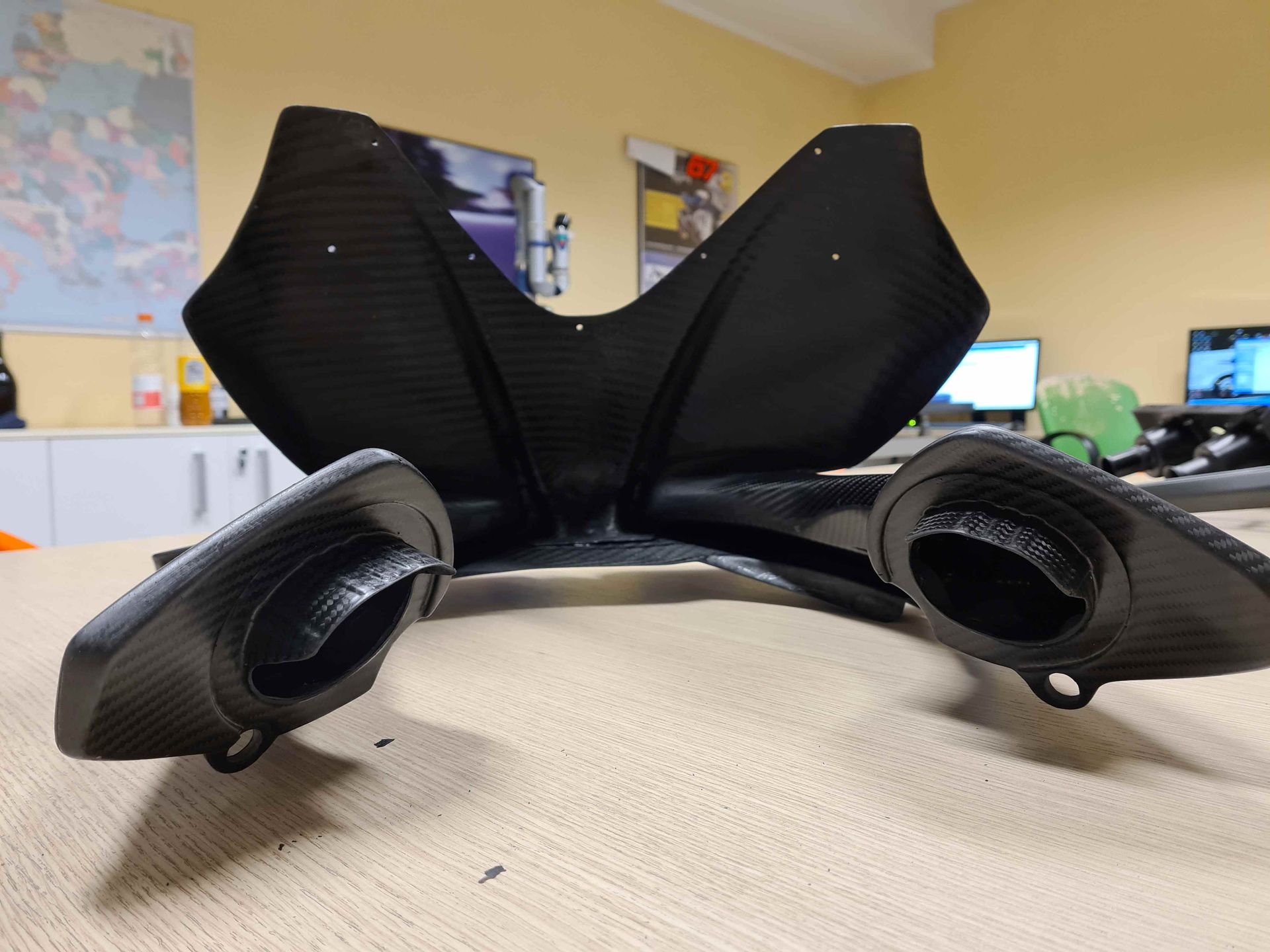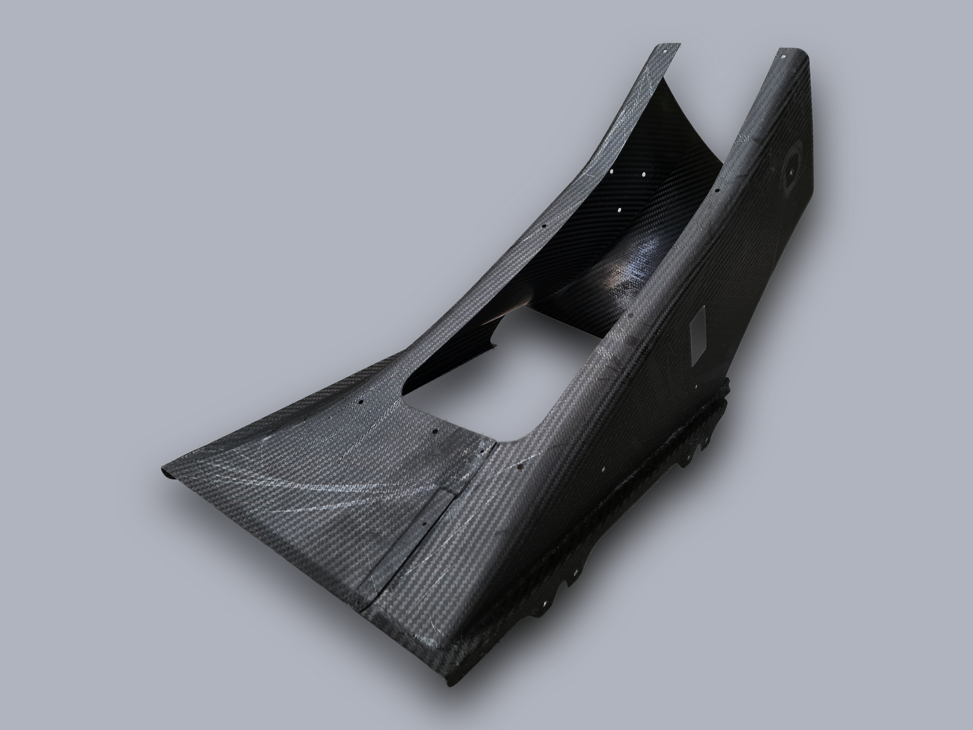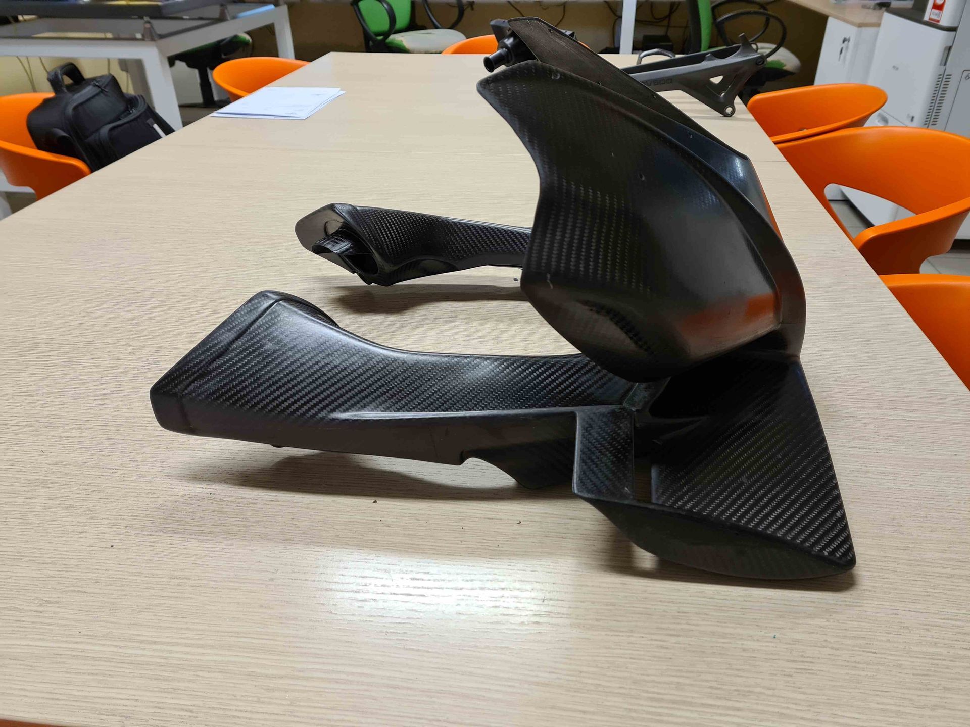 The fairing is made as a one-piece body, including the air ducts and fins using the autoclave process at 5 bar pressure. It is a one-off.